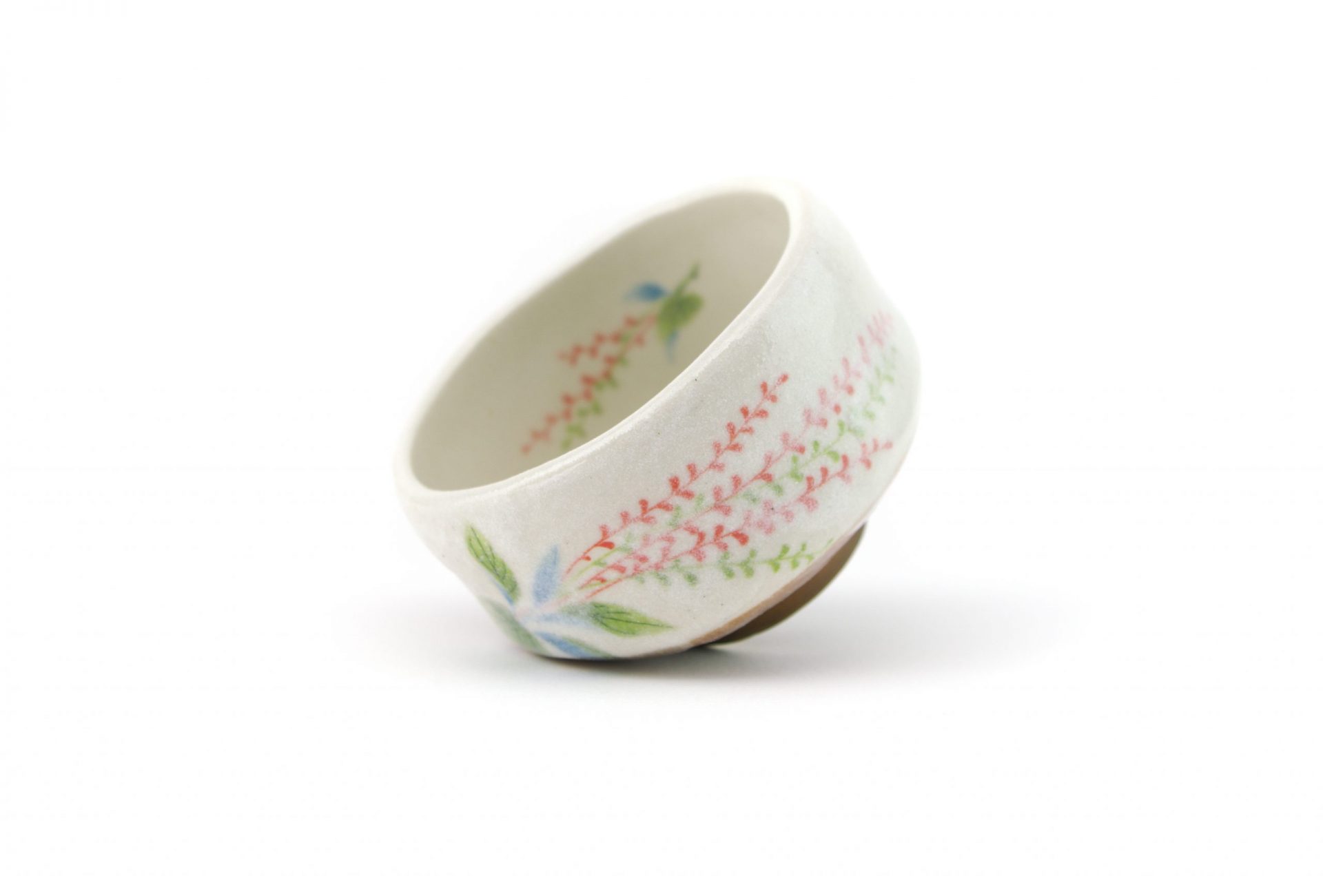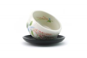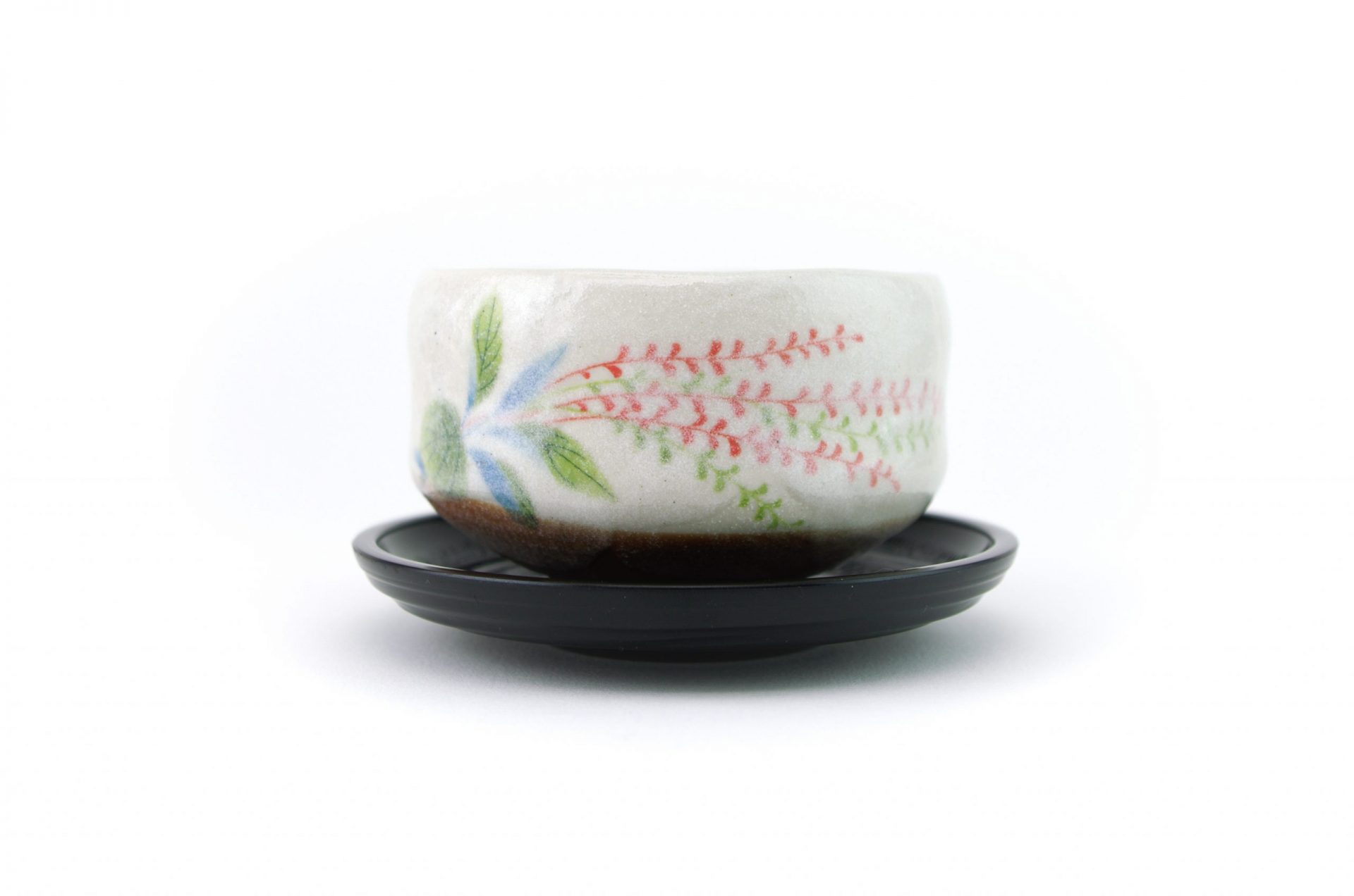 This matcha bowl is a fine example of Minoyaki wares from Gifu Prefecture in central Japan. It can be used as a cup for other Japanese teas, or as a small matcha bowl. The bowl is the perfect size for those who like to drink smaller portions of matcha and features a brown base with white top layer and a flower motif – each bowl is hand-made and unique.