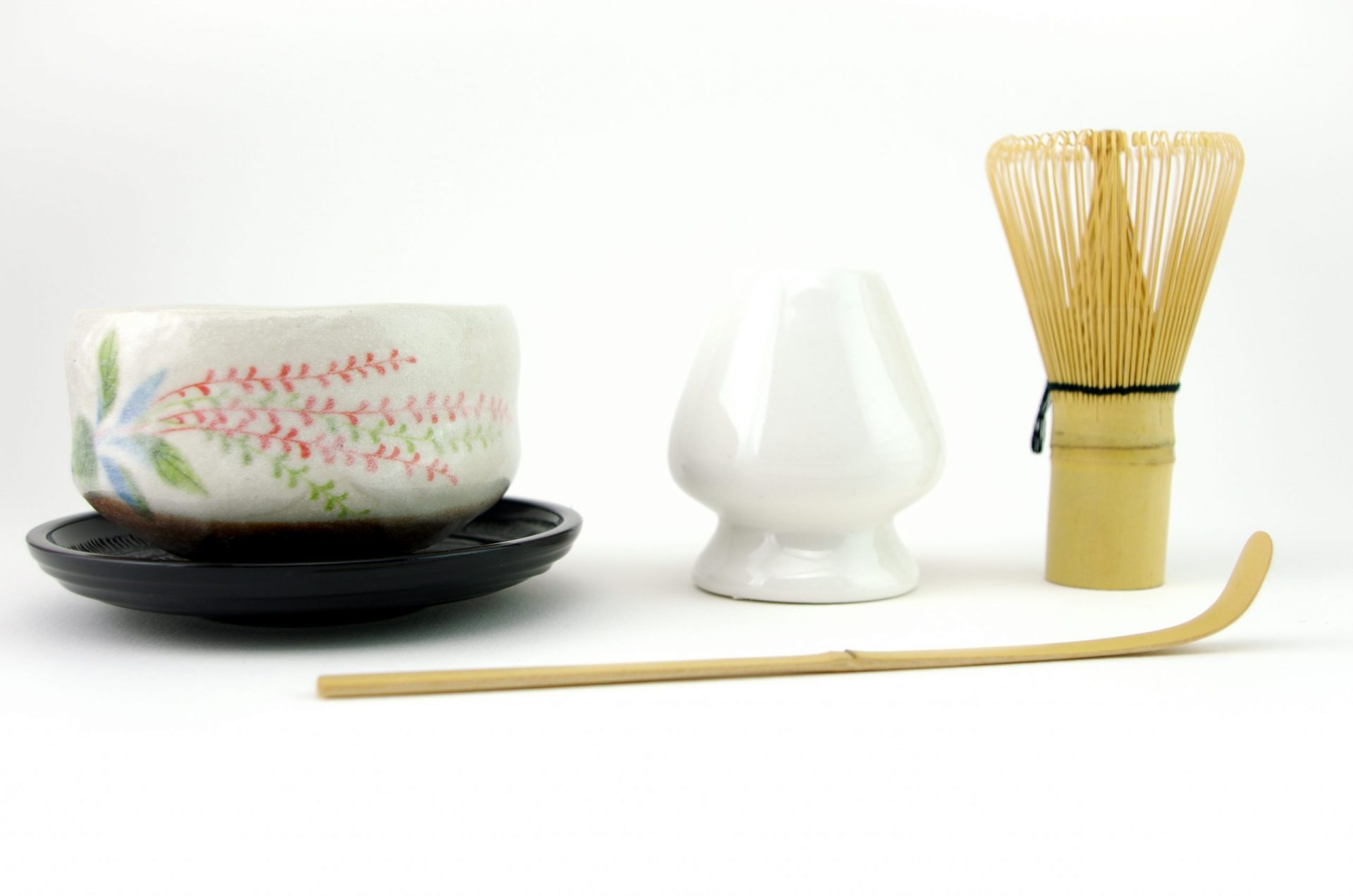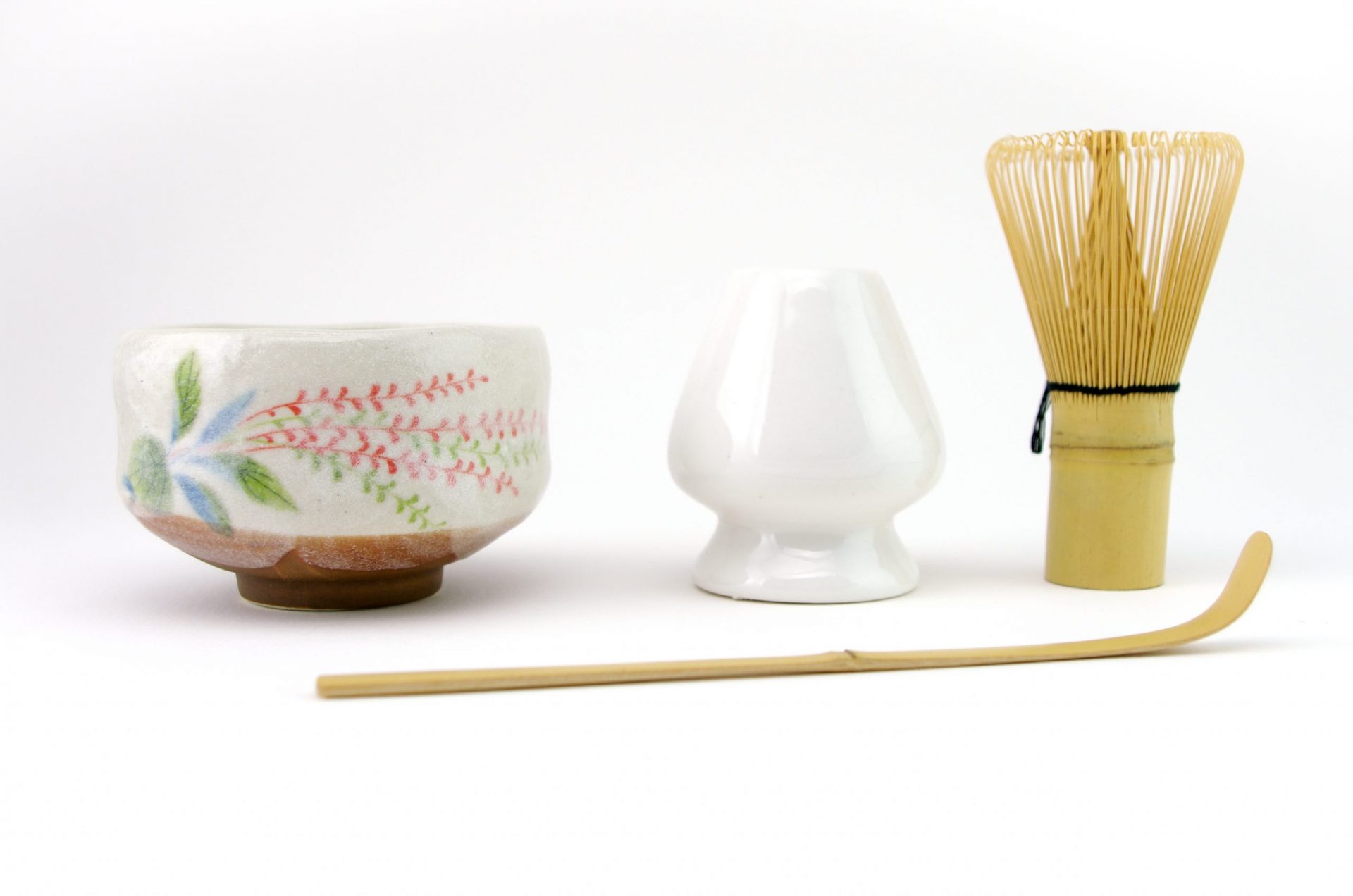This set of Matcha Whisk (Chasen), Matcha Scoop (Chashaku), Whisk Stand (Naoshi) and Ceramic Matcha Bowl (Chawan) are essential for making Matcha green tea in the traditional Japanese way.