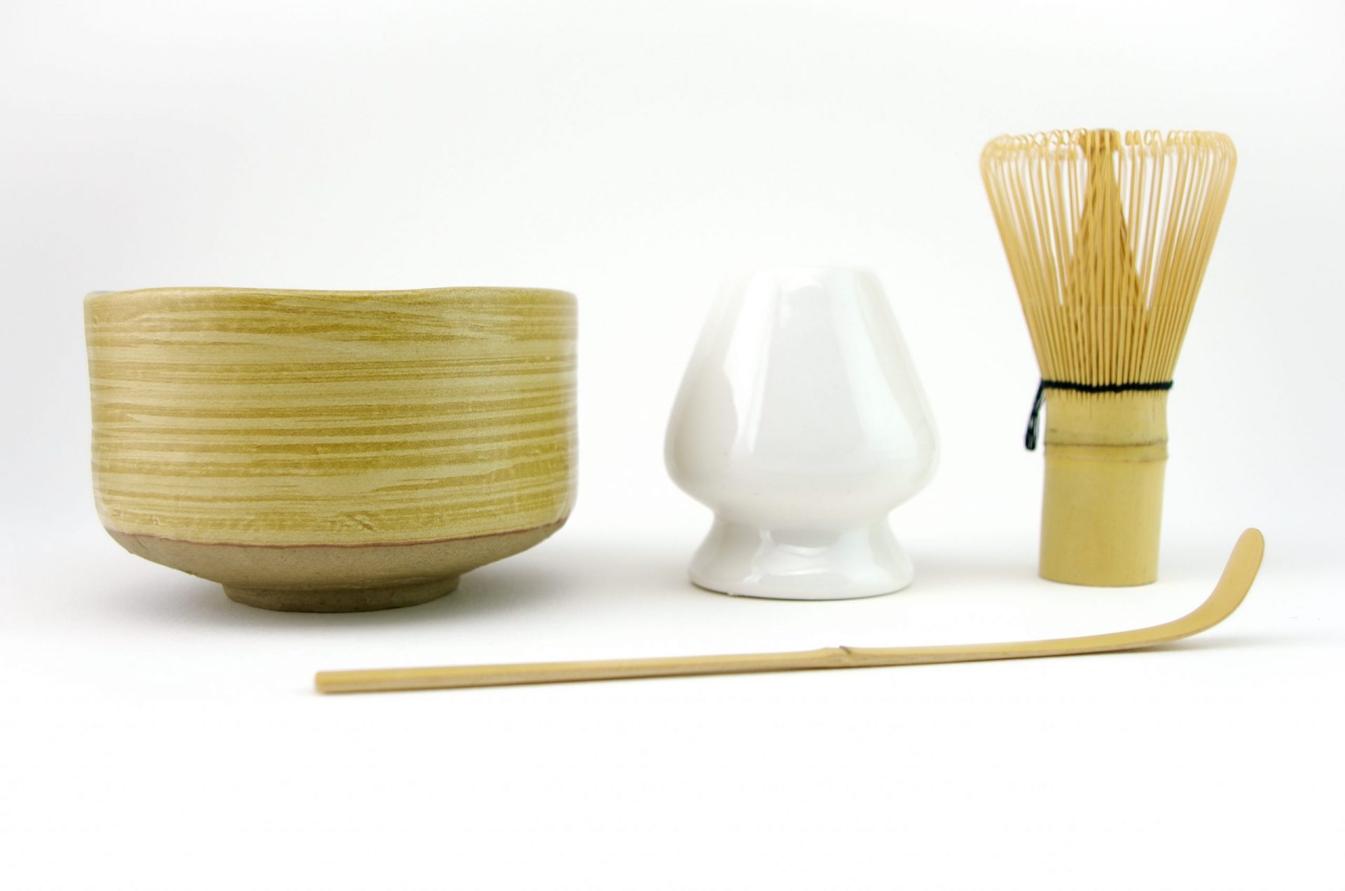 This set of Matcha Whisk (Chasen), Matcha Scoop (Chashaku), Whisk Stand and Ceramic Matcha Bowl (Chawan) are essential for making Matcha green tea in the traditional Japanese way.