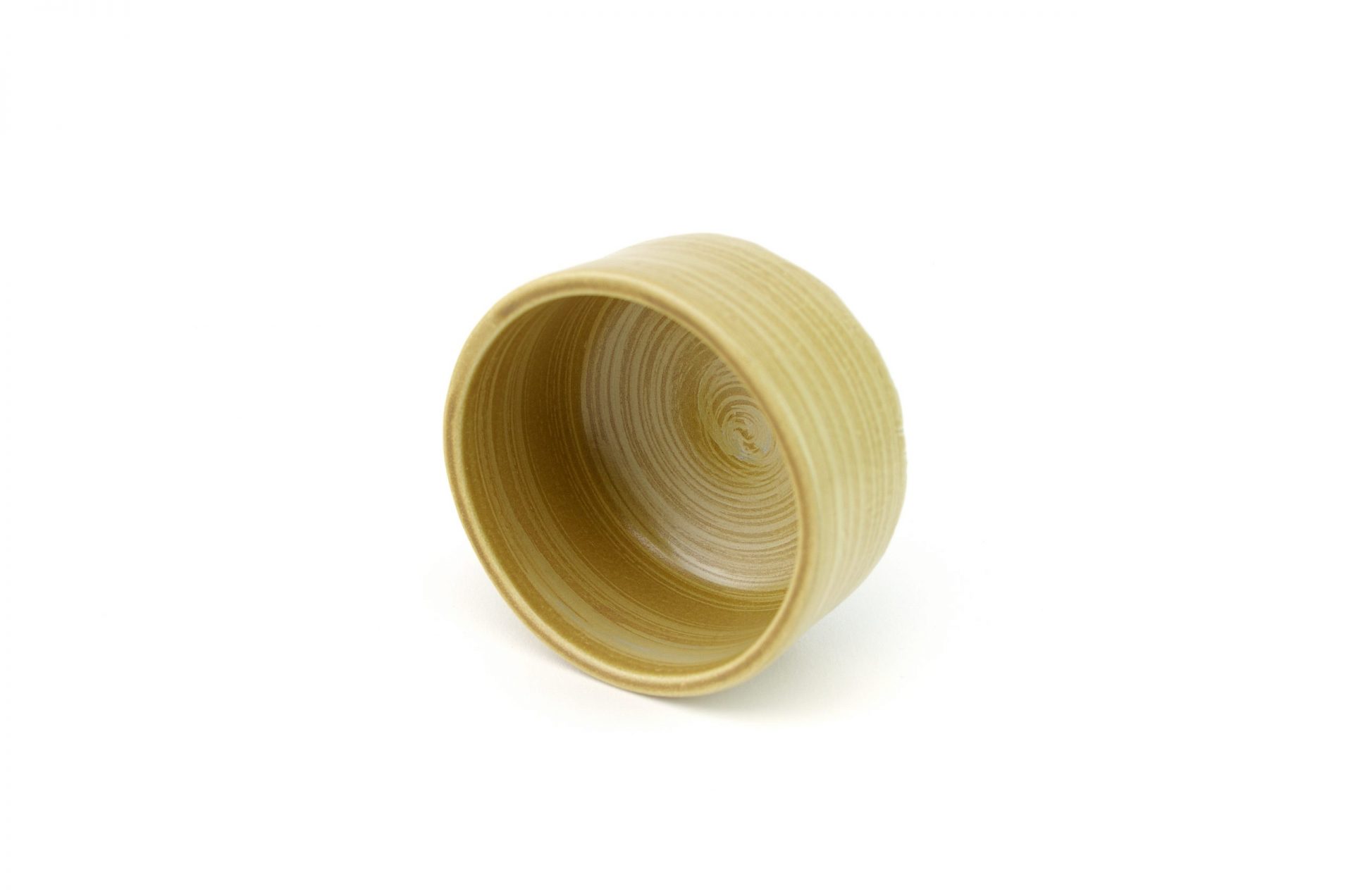 This Matcha bowl is a fine example of Minoyaki wares from the Gifu Prefecture in central Japan with this bowl featuring a yellow glaze and unique swirl-like motif. Both the whisk and scoop are crafted from natural white bamboo and feature a similar light brown shade. The ceramic white Whisk Stand provides the perfect place to store your 100 prong whisk as well as allowing it to keep a good shape.